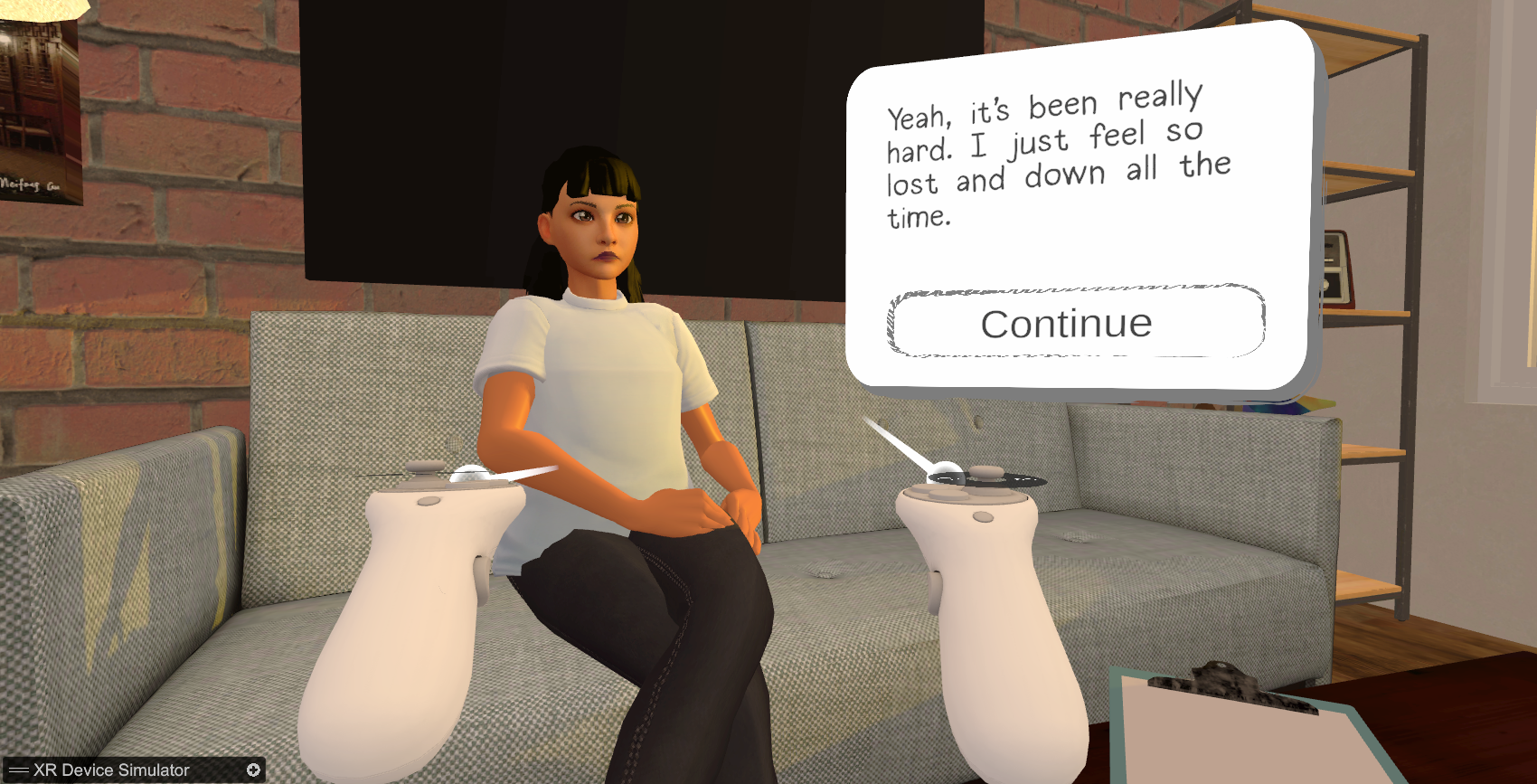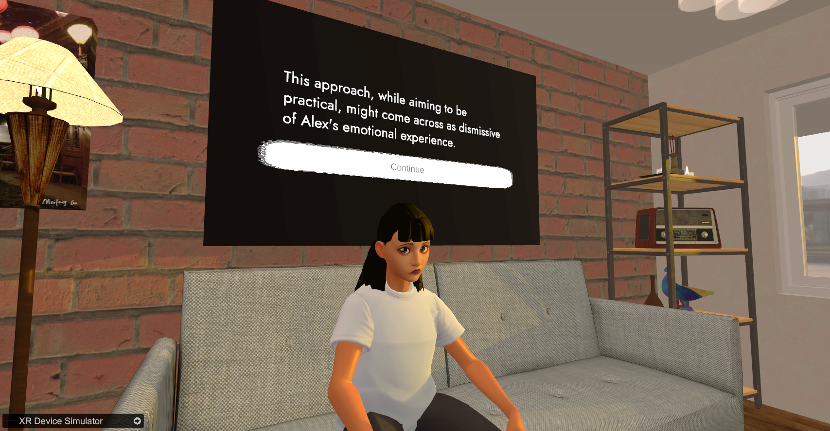 While working with NYU-CREATE and Silver, I developed the Minimal Viable Product (MVP) for an AI-powered, VR training tool to assist social workers and therapists in their training. I gained firsthand experience working in a simultaneous mental health-gaming space. This was an enlightening project to be included on. Each member of the lab that I spoke with gave me a new point of view on how to best develop with mental health and learning in mind. I received constant feedback on the best ways to adjust UI or create more immersive learning experiences.