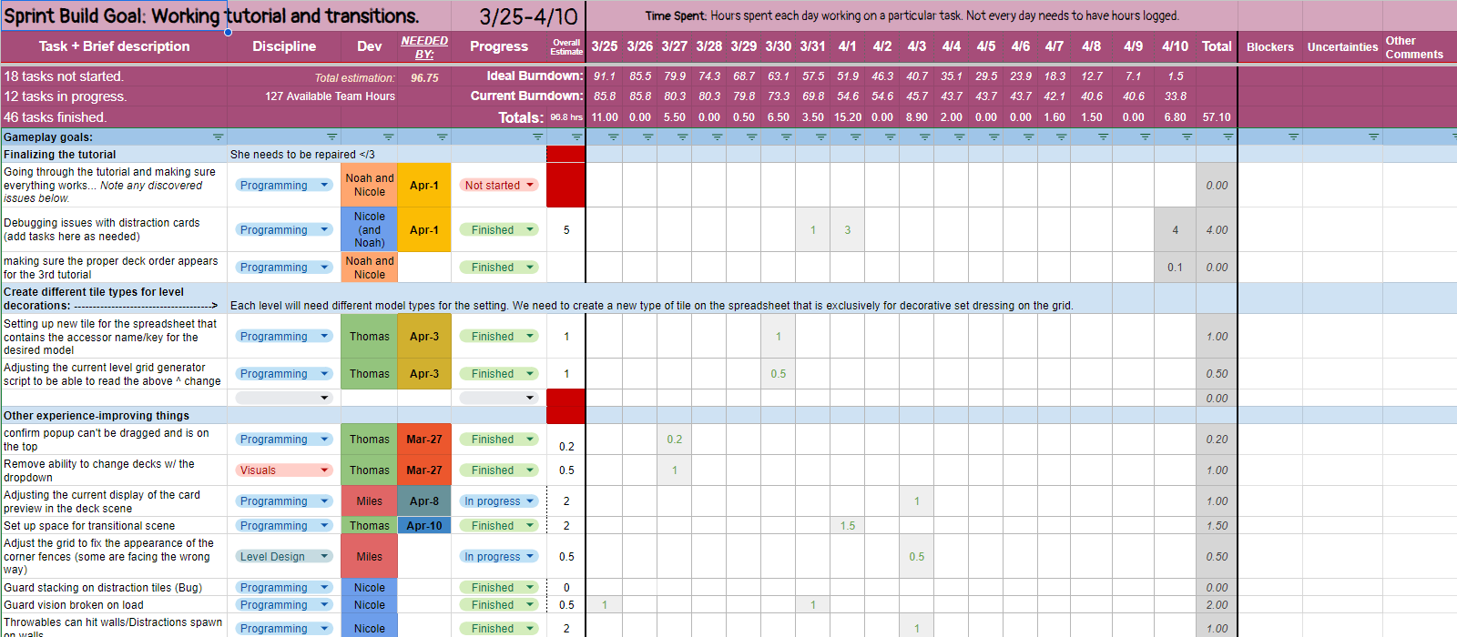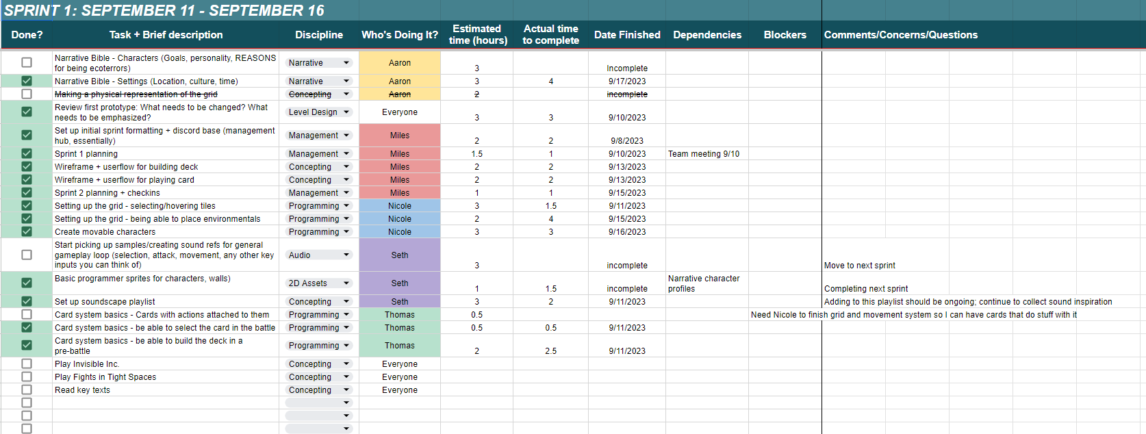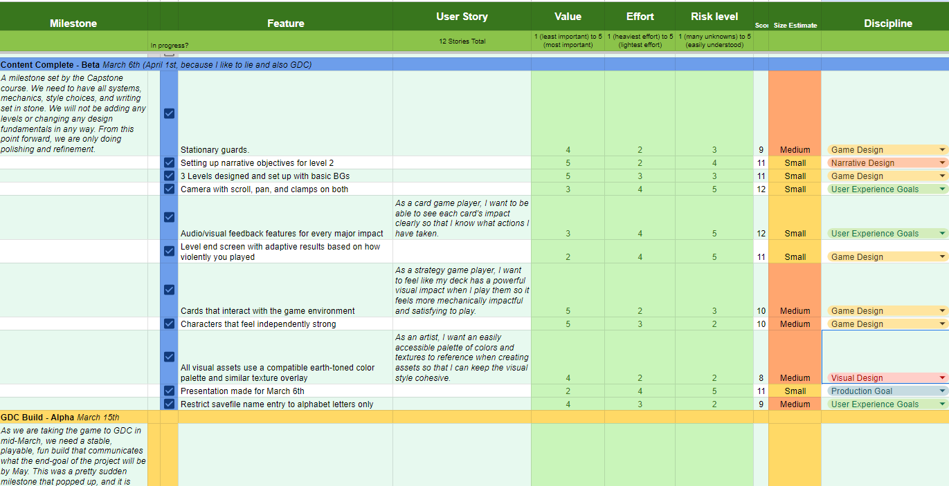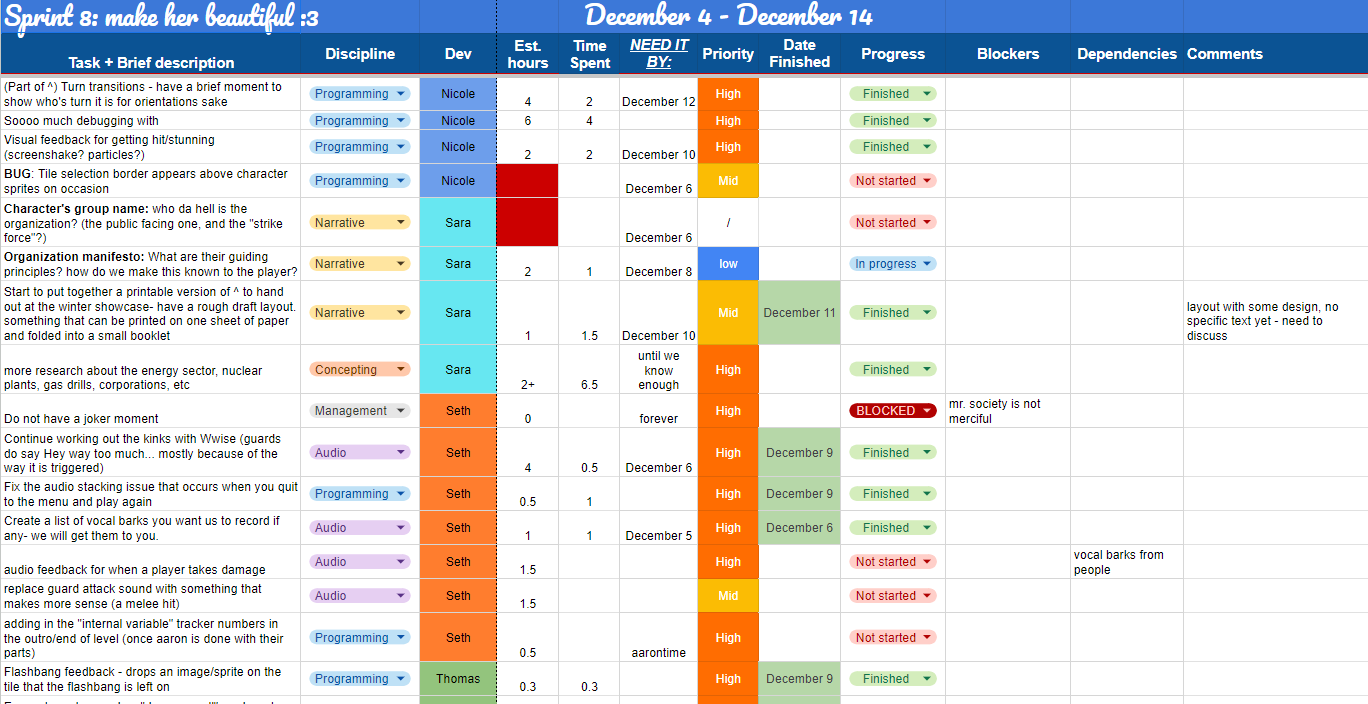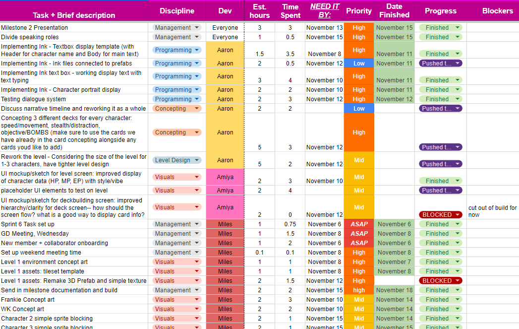 I’ve made used of spreadsheets, SCRUM production strategies, and Jira management structures to ensure our success and passing of milestones in the six month cycle we were allotted for development. We started off in a scramble- one of my friends, Nicole, had an idea for a game mere days before our thesis pitches were due. I was planning on just watching and joining a group that had already been formed, but Nicole really conveyed what a project like this meant to her. I saw a great potential in it. I knew it had to get through. I spent a few days putting together a solid pitch deck and with a little bit of convincing, had enough members to form a proper (albeit tiny) team.