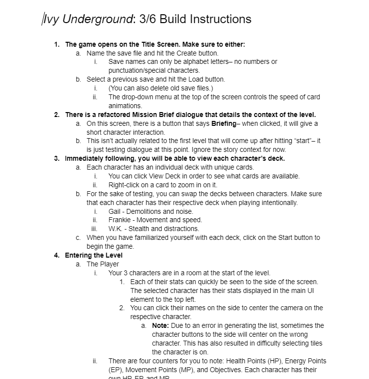My interpretation of SCRUM and Jira principles adapts to my team’s needs. The hard-set principles of sprints, logging, and wikis remain, but when we are in need of new guiding principles I make sure to get the group together to ensure everyone’s needs are being met. We hold roundtables and stand-ups every day we are together, and one of the notable changes we’ve had over the course of development is creating a better pipeline for our team’s unique quirks- especially because we are all college students with unusual schedules, deliverables can be turned in at unexpected times. Our development has shifted to be more adaptable and allows for less hard blockages. Modularity has always been a guiding principle of my design and development process and I’ve been passing this onto the Ivy Underground team in more ways than one. Everyone knows how the core systems and designs work, even if they aren’t experts or leads within the given discipline. Our documentation and standardization of everything from code to art allows all the needed information to be available to everyone, regardless of who is around. With so many people working on different pieces of the game, this has been essential to the project’s success.