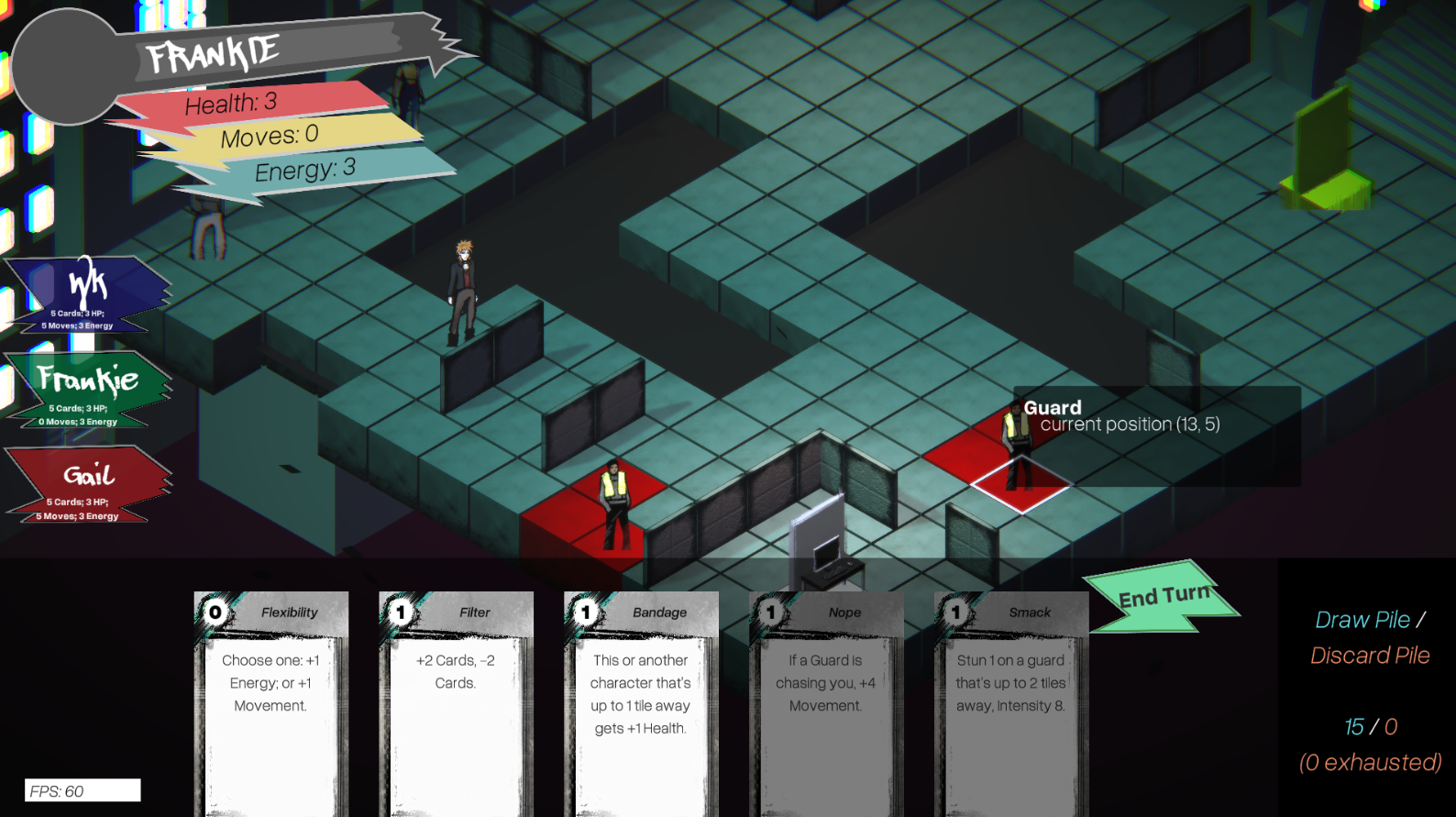 Engine: Being developed in Unity (C#). Level and card generation done in spreadsheets. Uses Wwise for audio. Art assets made in Photoshop, Illustrator, and Procreate.